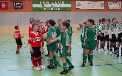 Unsere U 9 Mannschaft nahm heute an einem Turnier des SK Rapid Fanclubs Prugg in der Brucker Sporthalle teil. In den Gruppenspielen schlugen unsere Minis etwas überraschend alle Gegner (Bruck/Leitha mit 3:2, Hainburg und Sommerein mit jeweils 2:0) und wurden damit überlegen Gruppenerster. Somit hatte man sich fürs große Finale qualifiziert in dem die Minis des Österreichischen Rekordmeisters SK RAPID WIEN warteten.