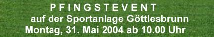 Juni 2004 Auf unserer Sportanlage sollte heute im Anschluss an die Meisterschaftspartie gegen Hundsheim ein Jugendclubbing, zu dem der Sportverein gemeinsam mit der Jugend einlädt, stattfinden! Aufgrund der vorherrschenden tristen Wetterlage wurde dieses EVENT vorrausichtlich auf Anfang September verschoben!!! |