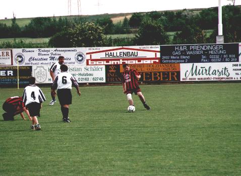 Juni 2004 Im heutigen letzten Meisterschaftsheimspiel unserer Kampf- und Reservemannschaft traf man auf das drittbeste Frühjahrsteams aus Hundsheim, dass seit 10 Spielen ungeschlagen ist. Für unsere Mannschaft galt es die Chance auf den Vizemeistertitel zu wahren. Doch unser Team begann, wie schon gegen Prellenkirchen, zu verhalten und ließ dem Gegner zu viele Räume. So kamen die Gäste zu Chancen und führten nach rund einer Viertelstunde mit 1:0. Ab diesem Zeitpunkt kam unsere Mannschaft auf Touren und beherrschte das Spielgeschehen immer deutlicher. Nach einer tollen Einzelaktion von Christopher Umathum erzielte Thomas Rupp das 1:1. Weitere Großchancen folgten, wie ein Stangenschuss von Peter Schenzel, oder zwei tolle Distanzschüsse von Thomas Schuster, die nur knapp über das Gehäuse streiften. In Hälfte legte man noch einen Gang zu und wurde mit dem 2:1 durch Christopher Umathum nach Vorarbeit von Rastislav Vavrus belohnt. In dieser Phase hatte man Torchancen en masse. Es folgte das 3:1 wiederum durch Christopher Umathum nach einem Schuss von der Strafraumgrenze. Endgültig machte man den "Sack" allerdings nicht zu da Roman Juras bereits alles überspielt hatte, aber nicht ins Tor traf und Peter Schenzel alleine vor dem Tormann verstolperte. Dies sollte sich rächen. In den letzten 10 Minuten riskierten die Gäste nochmals alles und kamen nach einer Unachtsamkeit auf 2:3 heran. Kurz vor Schluss, als die Ordnung endgültig verloren ging, kassierte man auch noch den Ausgleich, wobei es bis zum Schlusspfiff blieb. Die Zuschauer sahen ein gutes, schnelles Spiel, wobei unsere Mannschaft aufgrund der vorhandenen Torchancen einen Kantersieg ausließ und sich "nur" mit einem Unentschieden begnügen musste. Die Reserve gewann ihr Spiel mit 10:1! |