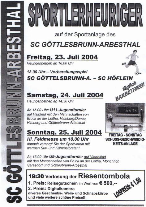 unseres diesjährigen Sportlerheurigen wurde nun fixiert! Er wird heuer erstmals auf unserer Sportanlage veranstaltet. Am Freitag findet im Rahmen dieses Events ein Vorbereitungsspiel gegen den ewigen Rivalen aus Höflein statt. Am Samstag wird ein U11-Turnier veranstaltet und am Sonntag ein U9-Turnier. Beginn ist jeweils um 15.00 Uhr. Natürlich gibt es auch heuer eine Riesentombola mit vielen tollen Preisen. Ein Los kostet wie im Vorjahr € 1,50. Als besondere Attraktion wird an allen drei Tagen eine Schuss-Geschwindigkeitsanlage aufgestellt, bei der man seine Schuss-Stärke ermitteln kann. Ich darf Sie schon jetzt herzlich zu diesem Fest einladen!!!