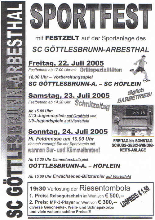 Montag, 14. November 2005 Der Vorstand des Sportvereines Göttlesbrunn-Arbesthal bedankt sich bei der heimischen Bevölkerung für die Unterstützung und die Spenden anlässlich der heurigen Haussammlung. |