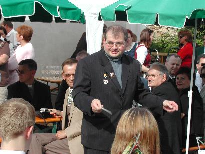 Am vergangenen Sonntag feierte Pater Mag. Paul Gnat mit der ganzen Bevölkerung von Göttlesbrunn seinen 40. Geburtstag im Pfarrhof. Natürlich kamen viele Leute um ihm zu gratulieren. Auch sämtliche Vereine waren zugegen und überreichten diverse Geschenke. Vom Sportverein bekam er ein neues Fahrrad, da sein derzeitiges schon sehr in Mitleidenschaft gezogen wurde. Bis in die späten Abendstunden wurde gefeiert und so wurde es ein gelungenes Fest, wobei auch alle Vereine bei der Bedienung der Festgäste mithalfen. Nachfolgend ein paar Schnappschüsse.