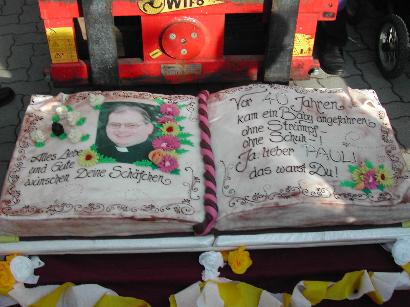 Paul dirigiert die Jugendblasmusikkapelle oben links: eine "riesige" Geburtstagstorte, die mit dem Gabelstapler transportiert werden musste! unten: das Geschenk des Sportvereines samt Nummertafel rechts: Pater Paul bei der Dankesrede mit dem "Pauli-Tropfen" der Winzer