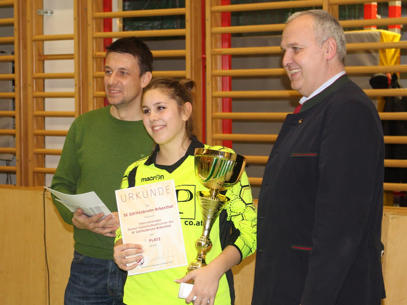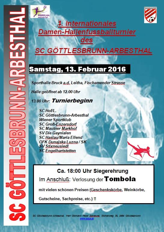 Donnerstag, 14. Jänner 2016 Am Samstag, dem 13. Feber 2016, also in knapp einem Monat, veranstaltet unser Damenteam bereits zum 4. Mal ein Damen-Hallenturnier in der Brucker Sporthalle. In der Zeit von 13.00-18.00 Uhr spielen 10 Damen-Teams um die begehrte Trophäe des Hallen-Champions. Infos gibt´s bei den beiden Trainern Christian Zeller (0664/1129080) und Richard Spenger (0660/5296535). Für Speisen und Getränke sorgt der SC Göttlesbrunn-Arbesthal! Schon jetzt laden sie die Mädl unseres Teams zu diesem Turnier ein und hoffen auf lautstarke Unterstützung! |