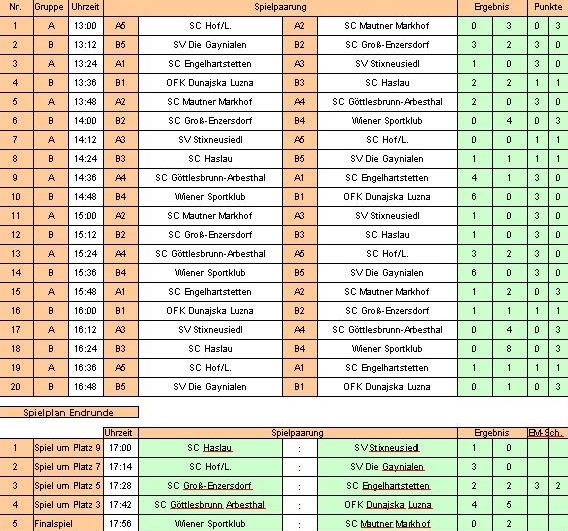 2016 In der Gruppe A erreichte man hinter Gastgeber Fischamend den 2. Platz. Im Halbfinale unterlag man dem späteren Sieger Marchegg. Im Spiel um Platz 3 schaffte man gegen den Veranstalter Fischamend die Revanche und sicherte sich den Pokal für Platz 3. Ergebnisse und Torschützen: SCGA - Fischamend 1:4 (Scholz - "Tor des Turniers" - im Fallen mit der Ferse über den eigenen Kopf ins Tor getroffen!) SCGA - Götzendorf 3:0 (2x Scholz, Mraz) SCGA - Hainburg 2:1 (Dag, Mraz) SCGA - Marchegg 1:3 (Dag) SCGA - Fischamend 2:1 (2x Dag) Turnierendstand: 1. Marchegg, 2. Schwadorf, 3. SCGA, 4. Fischamend, 5. Hainburg, 6. Berg, 7. Götzendorf, 8. Haslau |
