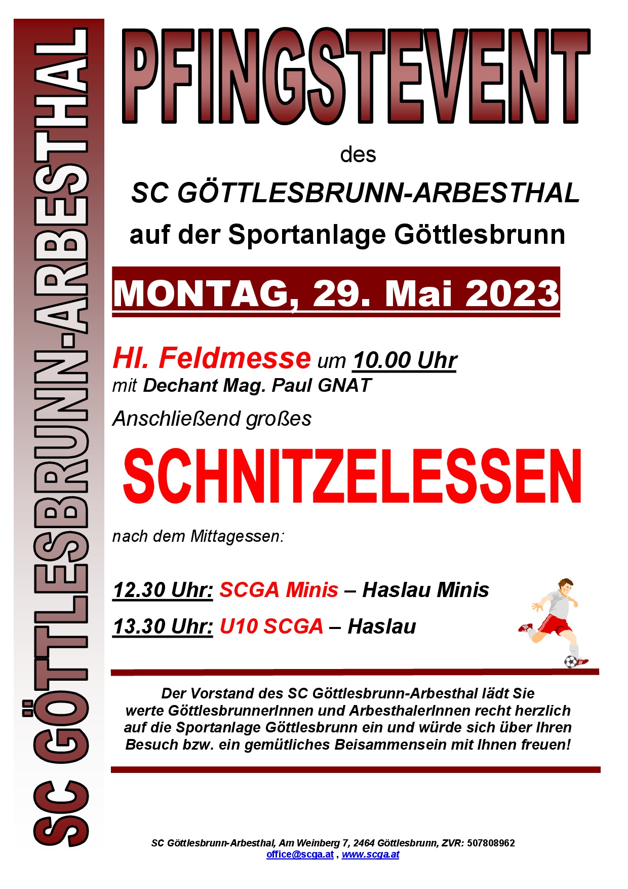 2023 Am heutigen Feiertag steht unser traditionelles Pfingstevent am Programm. Um 10.00 Uhr feiert Dechant Mag. Paul Gnat die traditionelle Feldmesse auf unserer Sportanlage! Nach dem genüsslichen Schnitzelessen finden ab 12.30 Uhr zwei Begegnungen unserer Jugendmannschaften gegen Haslau/Donau statt. Den Beginn machen unsere Minis gegen die Minis aus Haslau/Donau. Danach - um 13.30 Uhr - folgt das Kräftemessen der beiden U10-Teams. Schon jetzt lädt Sie der Vorstand zu dieser Veranstaltung recht herzlich ein und freut sich auf Ihr Kommen! |