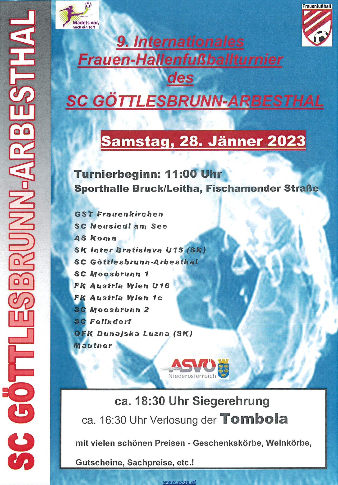 Samstag, 14. Jänner 2023 In zwei Wochen, am Samstag, den 28. Jänner 2023 veranstaltet unser Frauenteam bereits zum 9. Mal ein hochkarätiges internationales Damen-Hallenturnier in der Brucker Sporthalle. In der Zeit von 10.00-18.00 Uhr spielen 12 Damen-Teams um die begehrte Trophäe des Hallen-Champions. Für Speisen und Getränke sorgt der SC Göttlesbrunn-Arbesthal! |