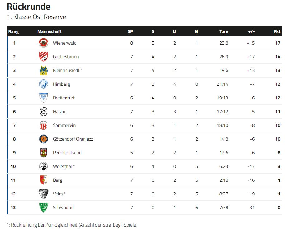 einen Kantersieg. Nach dem Auftaktsieg gegen Wolfsthal musste man in der 2. Runde die Stärke von Meisterschaftsfavoriten Himberg neidlos anerkennen. Noch dazu spielte Ex-Stürmer Lukas Werner bei der 0:5-Schlappe mit einem Dreier-Pack groß auf. Nun heißt es dieses Spiel schnell abhaken und volle Konzentration auf das nächste Auswärtsspiel in Traiskirchen. Tabelle Kampfmannschaft Unser Reserveteam blieb auch im 2. Frühjahrsspiel ungeschlagen und holte auswärts ein 2:2-Unentschieden. |