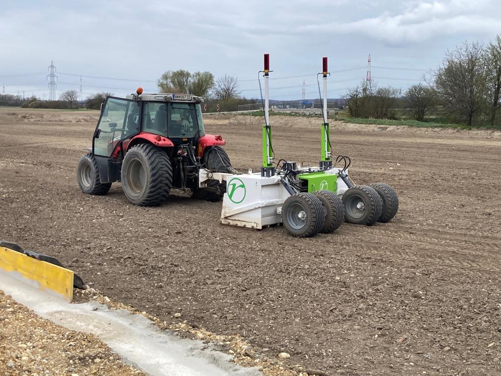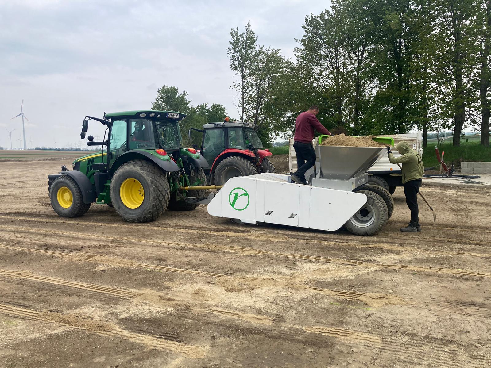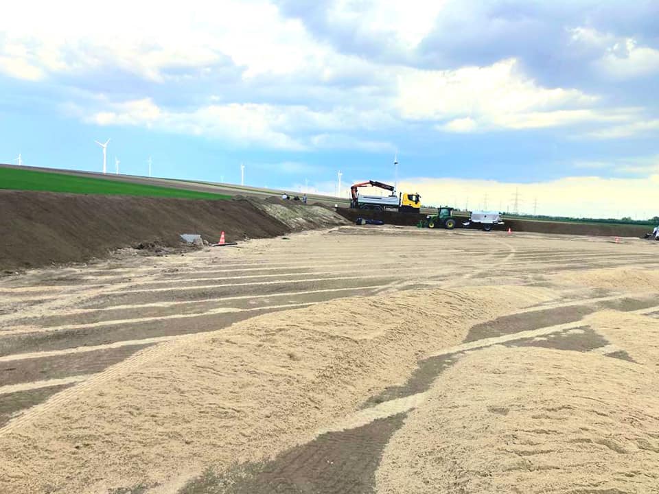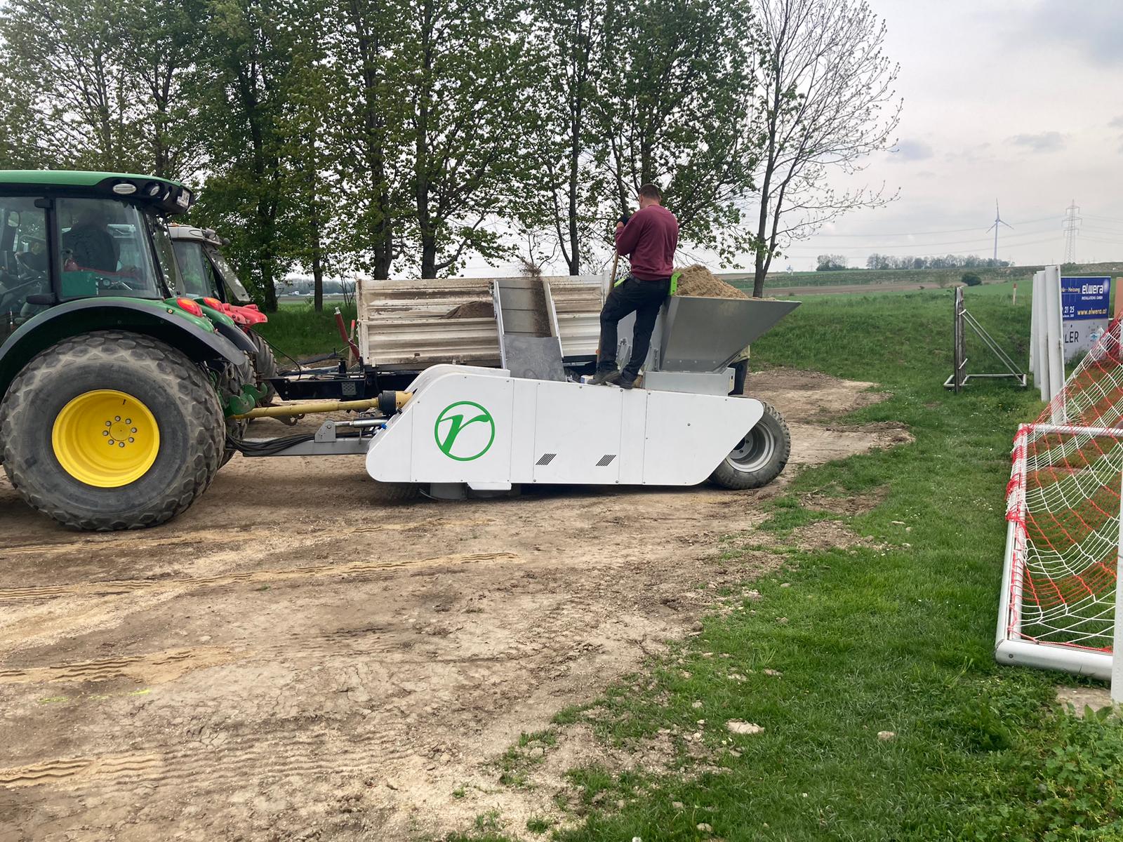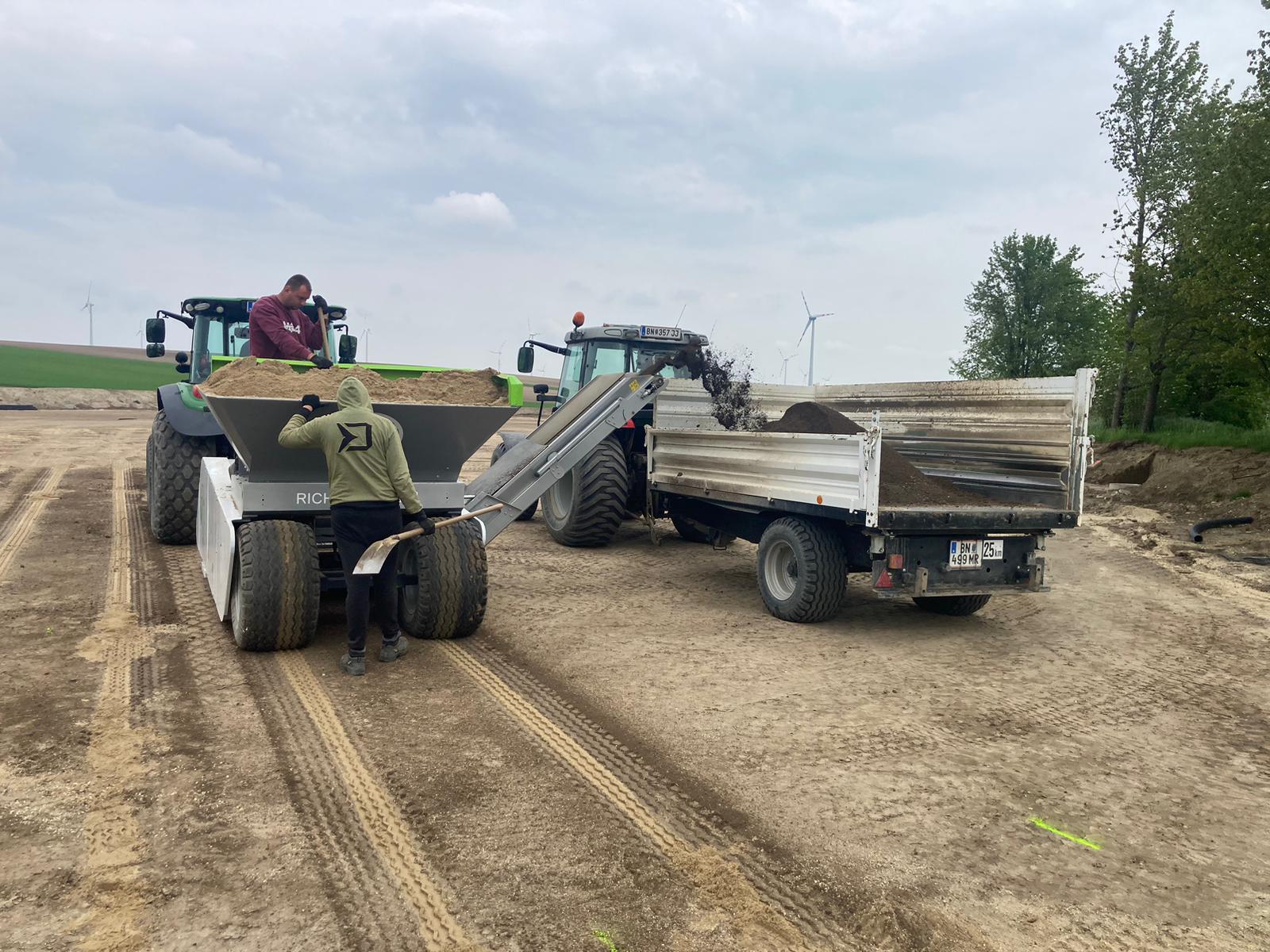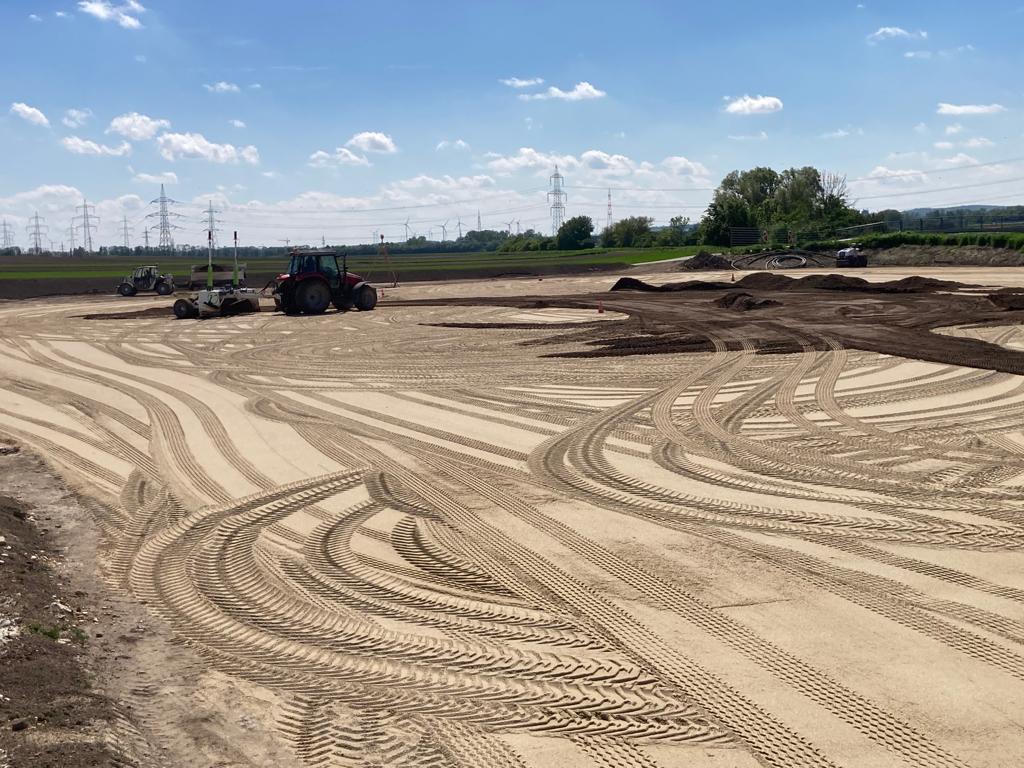 1.600 Tonnen Erdgemisch auf der Fläche verteilt. Anschließend werden die Regner