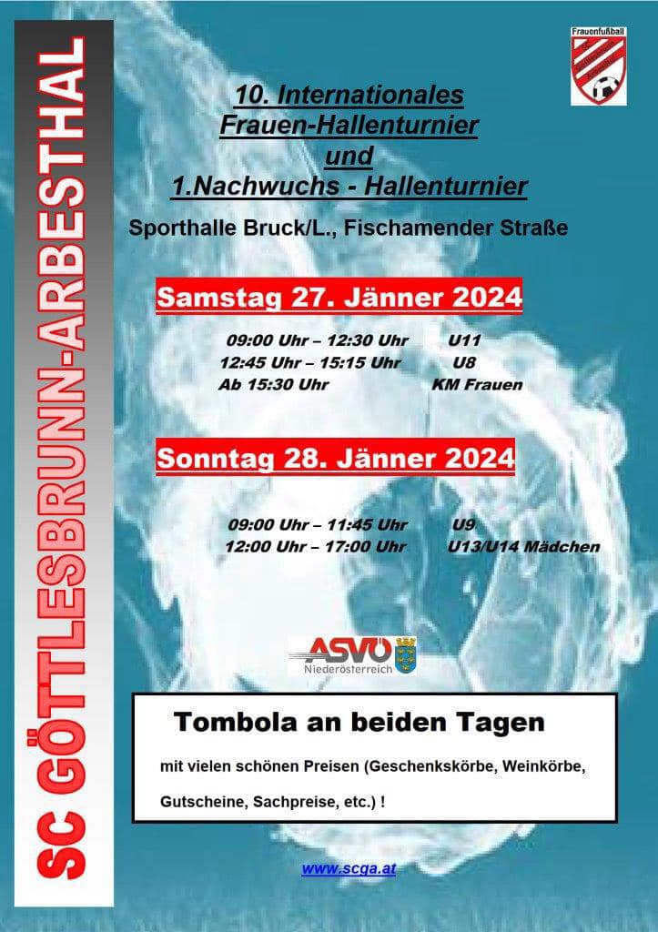 Montag, 29. Jänner 2024 Am vergangenen Wochenende veranstaltete der SCGA am Samstag und Sonntag Hallenturniere für Jugend- und Frauenteams. Bei der U8 klassierte sich das Team SCGA I an 3. Stelle und das Team SCGA II an 4. Stelle. Das U11 Team schloss das Turnier am 7. Platz ab, ebenso unser U14-Mädchenteam. Für unser Frauenteam reichte es zum 5. Endrang. Der SCGA bedankt sich herzlich bei allen Mannschaften und Zuschauern fürs Kommen und allen freiwilligen Helfern, die zum reibungslosen Ablauf beigetragen haben. |