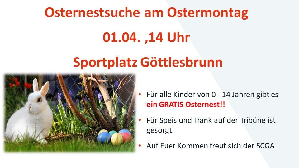 Montag, 1. April 2024 Am heutigen Ostermontag findet wieder eine Osternestsuche ab 14.00 Uhr auf unserer Sportanlage statt. Unsere Jugendabteilung freut sich auf zahlreiche Kinder mit Eltern, die daran teilnehmen. |