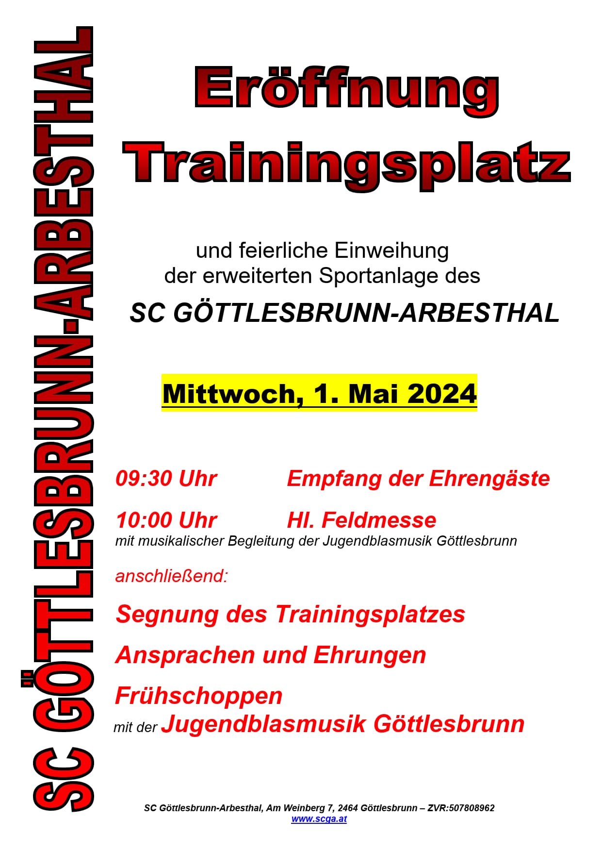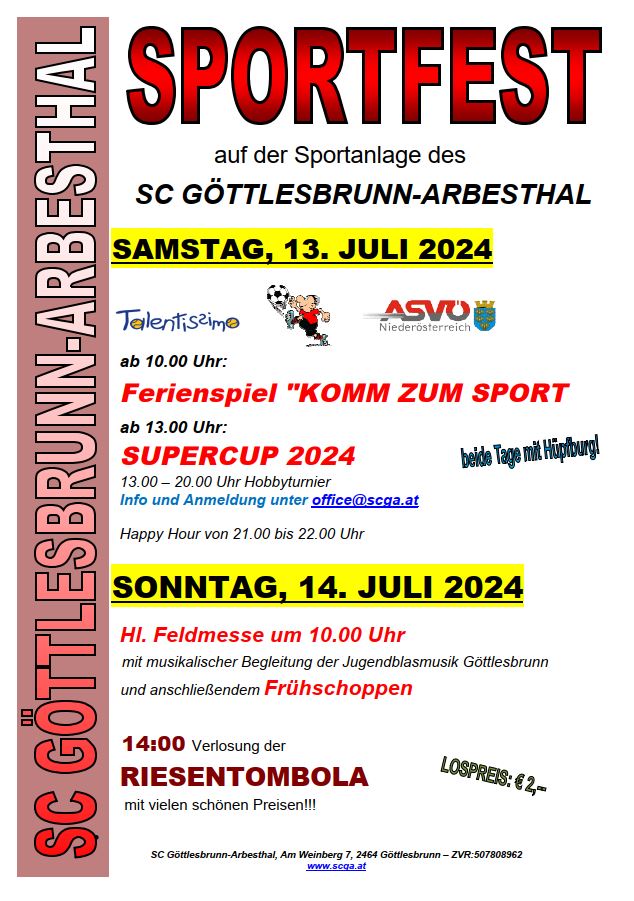 Samstag, 25. Mai 2024 Am heutigen Samstag laufen 7 Teams des SCGA auf. Auswärts jeweils um 10.00 Uhr gastiert unsere U8 und U9 in Kleinneusiedl und um 12.30 Uhr tritt unsere U11 beim B-Team aus Vösendorf an. Auf unserer Sportanlage finden folgende Begegnungen statt. Um 12.30 Uhr empfängt unsere U13-Mädchenmannschaft das Team aus Himberg und um 15.30 Uhr ist dann unsere U14-Mädchenmannschaft gegen die SPG Obersdorf an der Reihe. Weiter geht es mit dem Spiel der beiden Reserveteams, wobei Kaltenleutgeben um 17.30 Uhr zu Gast ist. Den Abschluss bildet die Partie der Kampfmannschaft ebenfalls gegen Kaltenleutgeben um 19.30 Uhr. |
