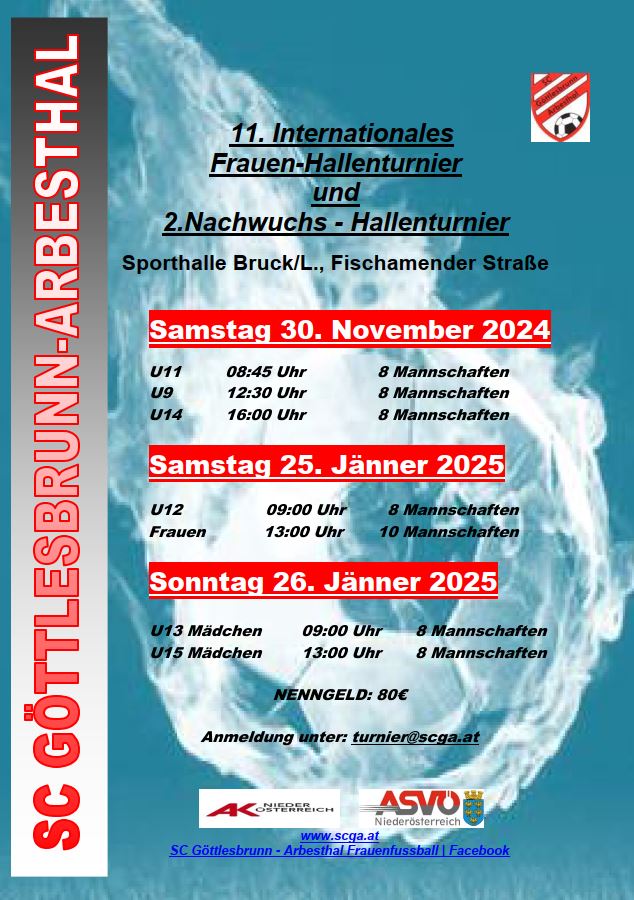 Hallenturnier unserer Jugendabteilung in der Brucker Sporthalle statt. Im Jänner 2025 findet dann der zweite Teil der geplanten Hallenturniere statt. Am Samstag, den 25. Jänner findet ein U12-Turnier und Wettbewerb der Frauen statt. Am Sonntag, den 26. Jänner 2025 folgende dann die Turniere für unsere U13- und U15-Mädchenmannschaften. Schon jetzt lädt Sie unsere Jugend- und Frauenabteilung zu diesen Wettkämpfen in die Brucker Sporthalle herzlich ein. |