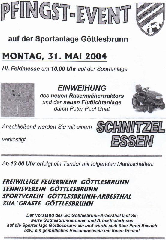 Der Sportverein Göttlesbrunn-Arbesthal lädt zum Pfingstevent am Montag dem 31. Mai 2004 auf unsere Sportanlage ein. Nachfolgend finden Sie das genaue Programm!
