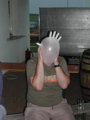 der uns aus der Patsche half. Nochmals ein herzliches Dankeschön an ihn! links unten: zu später Stunde wurde auch das Tanzbein geschwungen. Dabei entpuppte sich Thomas Weber als echter Tanzbär! rechts unten: Ein Besucher aus Göttlesbrunn, der nicht erkannt werden wollte und mehrere Gummihandschuhe zum Platzen brachte. |