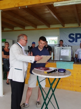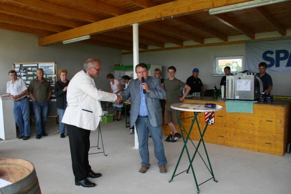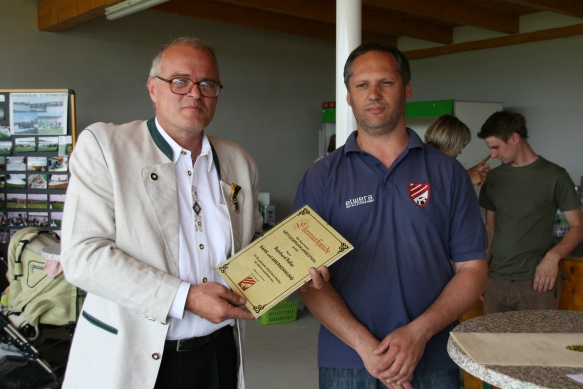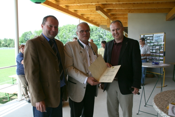 ![]() Übergabe der Ehrenurkunde anlässlich des Tribünenbaus an Obmann Reinhard Paller |