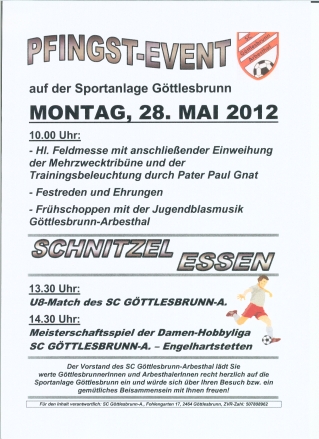 Der Sportverein Göttlesbrunn-Arbesthal veranstaltete zu Pfingsten, am Montag dem 28. Mai 2012 sein traditionelles Event auf seiner Sportanlage samt Festakt anlässlich der Einweihung der Mehrzwecktribüne und der Trainingsbeleuchtung. Nachfolgend ein paar Schnappschüsse vom diesjährigen Event!!!